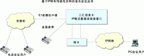 交互式電話會議與傳統(tǒng)的電話會議的區(qū)別就在于開會時不需要由會議主持人控制由某人發(fā)言,而是所有與會者可以自由發(fā)言,就如同坐在同一間會議室中一樣。三匯公司所有型號的基于DSP技術(shù)的語音卡,包括數(shù)字卡和模擬卡,均內(nèi)置了對交互式電話會議的支持,只要使用語音卡,無需額外的會議卡,就可以構(gòu)成具有完善功能的交互式電話會議系統(tǒng)。三匯公司還采用了獨(dú)創(chuàng)的分布式電話會議實(shí)現(xiàn)技術(shù),電話會議的關(guān)鍵資源----混音器分布在每一個通道中。因此語音卡對會議系統(tǒng)的支持具有極大的靈活性,既可以召開大量的三方會議,也可召開所有通道同時參加的大型會議,無論是會議的數(shù)量還是參加會議的人數(shù)均只受系統(tǒng)總通道數(shù)的限制。三匯語音卡還支持IP會議和傳統(tǒng)電話會議的混合應(yīng)用。