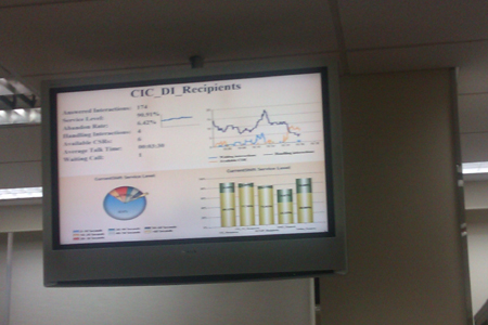 呼叫中心在三樓,在這里有先進(jìn)的軟件系統(tǒng)監(jiān)測(cè)出電話呼入、呼出量、棄線率、平均通話時(shí)長等各類信息并在電視屏幕上實(shí)時(shí)顯示。據(jù)索尼(中國)顧客互動(dòng)中心負(fù)責(zé)人介紹,這是采用的COPC管理體系。
