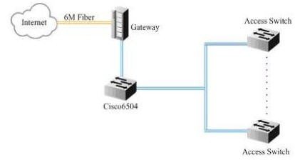 客房局域網(wǎng)通過一條6M的光纖接入CNC網(wǎng)絡(luò),網(wǎng)關(guān)設(shè)備承擔(dān)了DHCP、NAT和流量限制等功能,同時(shí)在思科6504上安裝有安全板卡,對(duì)內(nèi)部網(wǎng)絡(luò)安全進(jìn)行加強(qiáng)和防御。由于每個(gè)客房有2~3個(gè)信息點(diǎn),客房局域網(wǎng)總共有1300個(gè)左右的信息點(diǎn)。