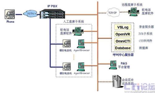 本方案采用IP-PBX 硬件平臺(tái)配合CTI系統(tǒng)軟件來(lái)建設(shè)呼叫服務(wù)系統(tǒng)。IP-PBX作為坐席接入的硬件接口平臺(tái),采用上海傲威科技有限公司自主研發(fā)的IP-PBX產(chǎn)品AVX2000pro來(lái)實(shí)現(xiàn),AVX2000pro提供標(biāo)準(zhǔn)RJ11固件接口,為坐席員提供語(yǔ)音接入,坐席員耳麥話機(jī)直接與RJ11接口互連。坐席電腦通過(guò)局域網(wǎng)口與CTI軟件服務(wù)系統(tǒng)互連。