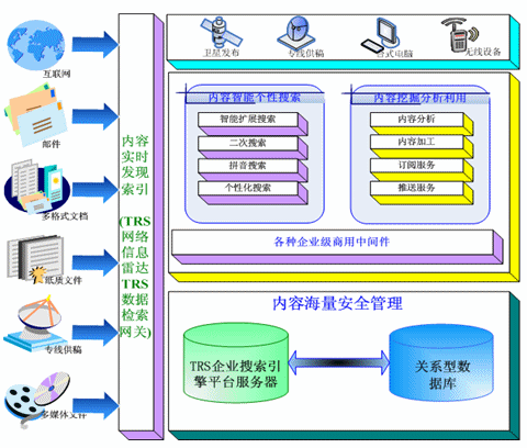TRS公司推出的企業(yè)搜索引擎解決方案,利用TRS公司多年來自主開發(fā)的TRS Database Server作為企業(yè)搜索引擎服務(wù)的平臺?梢詫㈦娦牌髽I(yè)內(nèi)外部多種格式、多種介質(zhì)形態(tài)、多種存儲方式的內(nèi)容信息,以實時的方式將這些信息進(jìn)行索引。并且在索引的過程中力求能夠做到準(zhǔn)確,并配合以相關(guān)智能語言技術(shù)做信息的去重、自動標(biāo)引等能力。其框架如圖: