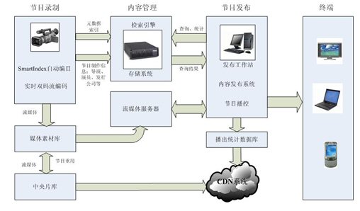 農(nóng)村黨員干部現(xiàn)代遠(yuǎn)程教育系統(tǒng)是涉及多個(gè)層面的系統(tǒng)工程,基礎(chǔ)設(shè)施建設(shè)內(nèi)容主要包括:節(jié)目制作平臺(tái)、中心資源庫(kù)、節(jié)目發(fā)布平臺(tái)、信息管理系統(tǒng)、接收終端等部分。該方案基于全球最成熟的寶麗星通軟件(北京)有限公司研發(fā)的寶麗通流媒體支撐平臺(tái),具備在現(xiàn)有網(wǎng)絡(luò)基礎(chǔ)架構(gòu)上開展豐富多彩的面向農(nóng)村黨員和農(nóng)民用戶的視聽類的綜合信息服務(wù)。系統(tǒng)結(jié)構(gòu)如下圖所示。