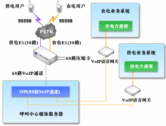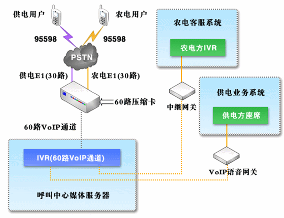對于呼叫中心系統(tǒng),由95598特別號碼統(tǒng)一接入,并且在供電呼叫中心系統(tǒng)與農(nóng)電呼叫中心系統(tǒng)之間采用中繼方式(模擬中繼或者數(shù)字中繼,視農(nóng)電方實際情況而定)進行話路連接,同時保證系統(tǒng)接入容量及其他資源能夠滿足統(tǒng)一的要求;在自動語音菜單中,分別設立供、農(nóng)電用戶層,用戶可以自行區(qū)分、選擇,對于農(nóng)電用戶在確定用戶類型之后,通過中繼將話路轉(zhuǎn)接到農(nóng)電方呼叫中心系統(tǒng)。