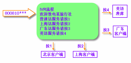 當(dāng)客戶撥打電話進(jìn)入MVB2000系統(tǒng)平臺(tái)的呼叫中心。通過(guò)IVR導(dǎo)航,可隨意打到各地的客戶端,再通過(guò)客戶端進(jìn)行更加細(xì)致的分類(lèi)。并且,每個(gè)客戶端都可以互相轉(zhuǎn)接。IVR流程可以無(wú)限下拉菜單。