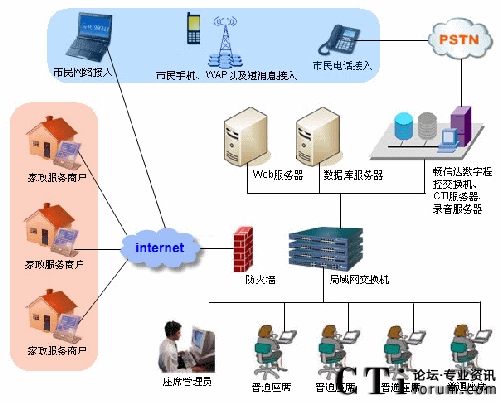 隨著國內(nèi)城市化地不斷加快,人口老齡化的加劇,人民群眾對家政服務(wù)需求也越來越旺盛,家政服務(wù)業(yè)的重要性也日益凸顯。為了規(guī)范家政服務(wù)市場、整合家政市場資源、培育家政服務(wù)示范性企業(yè),國家商務(wù)部、財務(wù)部于2009年4月下發(fā)了《關(guān)于推進(jìn)家政服務(wù)網(wǎng)絡(luò)體系建設(shè)的通知》的149號文件,啟動了家政服務(wù)網(wǎng)絡(luò)中心體系建設(shè)的項目,并提出了具體的規(guī)范和要求。以此為起點,為更好地服務(wù)社會滿足人民群眾日益增長的生活需求而努力。自文件下發(fā)以來,我公司就組織專門的項目組,對家政服務(wù)行業(yè)具體業(yè)務(wù)需求的調(diào)研以及開發(fā)工作。公司利用多年的開發(fā)經(jīng)驗,經(jīng)過幾個月的努力,終于在8月份完成了暢信達(dá)家政服務(wù)網(wǎng)絡(luò)中心的全套建設(shè)方案。與其它系統(tǒng)固化的功能設(shè)計不同,該方案可以靈活地定制業(yè)務(wù)模塊,方便各地的家政公司根據(jù)本市的情況和需求,確定適合自身的業(yè)務(wù)流程。系統(tǒng)業(yè)務(wù)模塊完整地覆蓋了家政服務(wù)的業(yè)務(wù)范圍與重點。并將家政服務(wù)的業(yè)務(wù)分為營業(yè)系統(tǒng)、賬務(wù)系統(tǒng)、后臺系統(tǒng)等部分,貫穿了市民從訴求提交、工單派發(fā)、工單處理、財務(wù)結(jié)算到回訪反饋的各個方面。系統(tǒng)還提供了完善的報表模塊準(zhǔn)確反映業(yè)務(wù)和系統(tǒng)運營狀況,有力地支持對平臺進(jìn)行運營管理工作。另外在方案設(shè)計上,除了滿足業(yè)務(wù)處理需要外,還充分考慮到系統(tǒng)的適應(yīng)性、穩(wěn)定性和處理的能力。首先為了滿足各地市對家政平臺的不同需求,公司專門推出了基于IBM服務(wù)器的和暢信達(dá)標(biāo)配服務(wù)器的兩種建設(shè)方案。暢信達(dá)標(biāo)配服務(wù)器方案可提供最低4模擬外線最多1條數(shù)字中繼(E1)接入,適用于初期規(guī)模較小且投資規(guī)模不大的客戶。而基于IBM服務(wù)器的方案,則主要是滿足業(yè)務(wù)量較大,同時對設(shè)備配置要求高的城市,以數(shù)字線接入為主。多種建設(shè)模式充分體現(xiàn)了方案的靈活性、可擴展性的特征,有效地減少了運營風(fēng)險,提升了個性化定制化服務(wù)的水平。其次,根據(jù)家政市場需求預(yù)測以及已開通家政服務(wù)網(wǎng)絡(luò)中心城市的實際運營情況,一個中型城市,預(yù)計電話開通之后,話務(wù)量平均每天近3000個,這就要求系統(tǒng)不但有穩(wěn)定的性能而且要有強大的處理能力。我公司從系統(tǒng)平臺構(gòu)建、業(yè)務(wù)流程設(shè)計、設(shè)備性能、組網(wǎng)設(shè)計等方面著手,為系統(tǒng)提供了足以確保安全穩(wěn)定運行的支持。