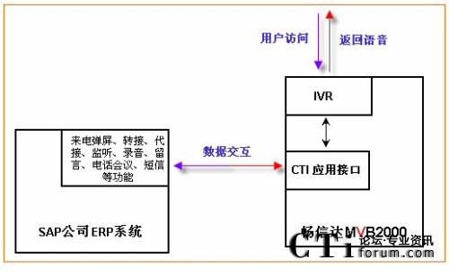 通過集成,不但可以實現(xiàn)與SAP公司ERP系統(tǒng)的實時數(shù)據(jù)傳輸,實現(xiàn)客戶管理、日常辦公,并且可使ERP系統(tǒng)上具有:點擊外呼、批量外呼、來電彈屏、收聽錄音、查看報表、監(jiān)控電話線路等更多增值功能,詳細接口內(nèi)容見《MVB2000 WEB開發(fā)接口》。