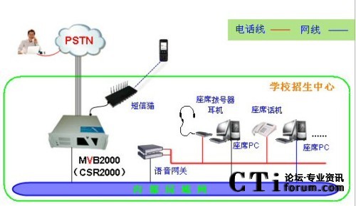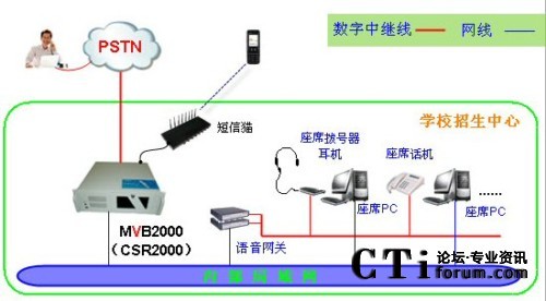 暢信達(dá)電話(huà)招生呼叫中心是采用數(shù)字中繼線(xiàn)(或者模擬電話(huà)線(xiàn))接入,人工座席受理,采用MVB2000作為呼叫中心交換系統(tǒng),CSR2000作為呼叫中心業(yè)務(wù)系統(tǒng)的系統(tǒng)架構(gòu)形式,系統(tǒng)架構(gòu)圖如下: