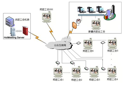 新疆建設(shè)兵團(tuán)工會下設(shè)有14個師工會,111個團(tuán)場工會.共有200個用戶同時參加視頻會議。中心服務(wù)器帶寬為100M光纖,各地終端通過網(wǎng)通2M寬帶接入,每個師、團(tuán)級會場都有自己獨(dú)立的機(jī)房和會議室,適合進(jìn)行基于IP網(wǎng)絡(luò)視訊會議的應(yīng)用,在這個網(wǎng)絡(luò)平臺上,優(yōu)視(URSACOM)HotMeeting富媒體視頻會議系統(tǒng)所提供的高質(zhì)量的視頻圖像和方便易用的文檔、文件共享功能,使得兵團(tuán)工會領(lǐng)導(dǎo)能夠在這個平臺上進(jìn)行從桌面討論到會議室正式會議等各種規(guī)模應(yīng)用。通過HotMeeting富媒體視頻會議系統(tǒng),除了進(jìn)行全團(tuán)工會系統(tǒng)例會,工作交流等常見的應(yīng)用之外,遠(yuǎn)程培訓(xùn)等也是經(jīng)常進(jìn)行的內(nèi)容。各個師、團(tuán)工會系統(tǒng)能利用數(shù)據(jù)功能和兵團(tuán)總工會協(xié)調(diào)業(yè)務(wù),也能把平常培訓(xùn)的會議材料進(jìn)行詳細(xì)介紹,節(jié)約了以前培訓(xùn)所花費(fèi)的大量精力和時間。具體網(wǎng)絡(luò)拓?fù)湟娤聢D: