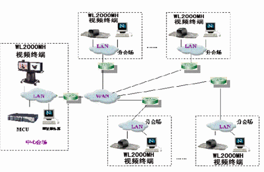 在控制中心,配置一臺優(yōu)視USRA MCS-4016多點控制器(MCU)。各會場各配置一臺WL-2000MH視頻會議終端。