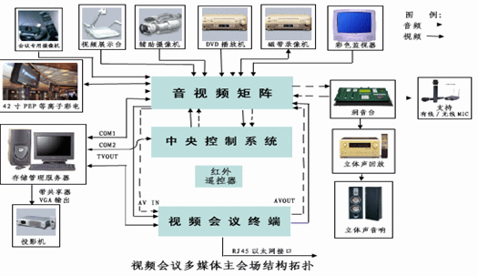 根據(jù)貴單位的分布特點,視頻會議會議系統(tǒng)建立7個會場,其中主會場一個,設(shè)在大樓的會議室,分會場6個,設(shè)在各下屬單位會議室。傳輸信道采用系統(tǒng)內(nèi)部的寬帶IP綜合網(wǎng)絡(luò)。