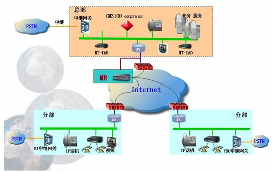 由于電信運(yùn)營(yíng)商的線路租賃費(fèi)用非常昂貴,對(duì)于中小企業(yè)來(lái)說(shuō)是一項(xiàng)不小的負(fù)擔(dān),所以中小企業(yè)的組網(wǎng)方式一般采用ADSL方式,來(lái)降低費(fèi)用,而ADSL的組網(wǎng)方式往往都經(jīng)過(guò)了幾層地址轉(zhuǎn)換了,這樣在分部或分支機(jī)構(gòu)的IP電話終端就無(wú)法穿透防火墻,實(shí)現(xiàn)和外面成功通話,所以需要在總部配置1臺(tái)媒體路由器(MR)來(lái)做語(yǔ)音代理,完成呼叫連接的建立。