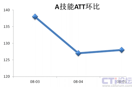 3月份開(kāi)始采用新上崗員工和隊(duì)列溢出等策略接聽(tīng)處理A技能話務(wù),隨著業(yè)務(wù)熟悉度的提高,ATT從138秒下降到127秒,環(huán)比有8%的下降幅度,說(shuō)明加強(qiáng)培訓(xùn)操作,可以有效降低ATT。