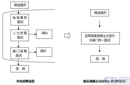 從上圖不難看出,通過(guò)應(yīng)用視高(Seegle)視頻會(huì)議系統(tǒng)進(jìn)行招聘,能大大縮短流程和周期,免除了求職者一次次的來(lái)回奔波,方便異地進(jìn)行面試。企業(yè)不僅可以在當(dāng)?shù)卣衅,更可以將招聘延伸到全?guó),甚至世界。