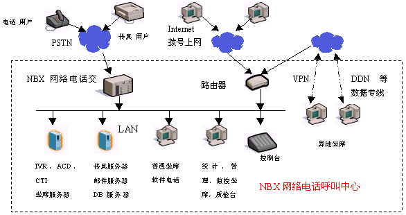 呼叫中心一般又稱為客戶服務(wù)中心,指企業(yè)或團(tuán)體通過公開一個(gè)電話特服號(hào)碼(如:12315、95000等),提供對(duì)客戶的電話服務(wù)。NBX網(wǎng)絡(luò)電話呼叫中心是基于3Com 公司NBX網(wǎng)絡(luò)電話交換機(jī)平臺(tái)構(gòu)筑的新一代語音、數(shù)據(jù)兩網(wǎng)合一的統(tǒng)一呼叫中心系統(tǒng),支持統(tǒng)一消息服務(wù),統(tǒng)一外部訪問路由,是各類傳統(tǒng)呼叫中心的升級(jí)換代產(chǎn)品。