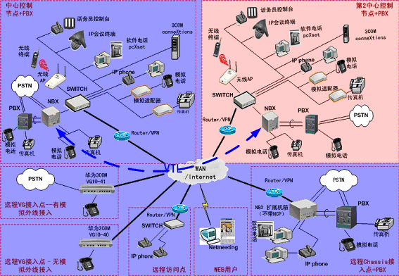 ③.遠程接入的辦公室不再需要專用的 PBX, 只需要將3Com NBX電話終端接入到WAN網(wǎng)中,就能地實現(xiàn)在WAN或Internet上與3Com NBX 網(wǎng)絡電話系統(tǒng)的互連。