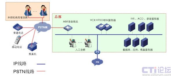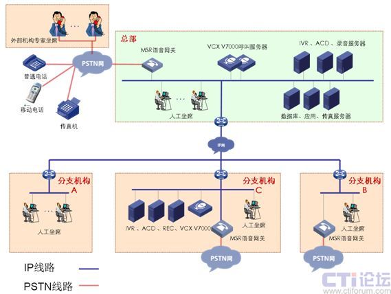 分支機(jī)構(gòu)B:網(wǎng)絡(luò)通過VPN技術(shù)與總部實(shí)現(xiàn)數(shù)據(jù)語(yǔ)音傳輸,部署MSR語(yǔ)音網(wǎng)關(guān)與當(dāng)?shù)豍STN網(wǎng)連接,IP坐席。兩地申請(qǐng)相同的客服號(hào)碼,兩地內(nèi)撥打客服號(hào)碼,客戶無(wú)長(zhǎng)途話費(fèi)產(chǎn)生。適用與總部與分支處在不同省市。