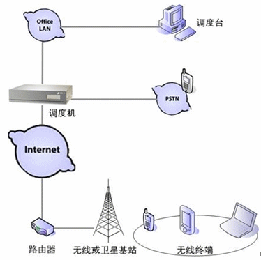 調(diào)度機(jī)通過(guò)有線網(wǎng)絡(luò)連接到各無(wú)線基站或衛(wèi)星地面站,利用原有的調(diào)度功能,可對(duì)各種無(wú)線終端進(jìn)行調(diào)度。目前除了衛(wèi)星以外,還可利用WiFi、SCDMA等無(wú)線技術(shù),根據(jù)使用范圍的大小來(lái)選擇不同的無(wú)線網(wǎng)絡(luò)。