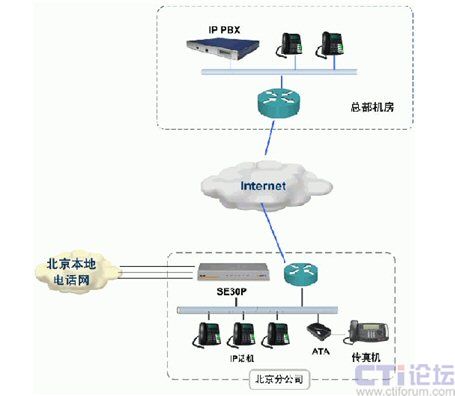 如上圖所示,通過(guò)SE30P的內(nèi)置FXO接口,可以實(shí)現(xiàn)與北京PSTN網(wǎng)絡(luò)的互聯(lián),解決北京分公司與中國(guó)用戶(hù)的通信;通過(guò)SE30P的IP中繼方式,實(shí)現(xiàn)與總部的IP PBX互聯(lián),變國(guó)際長(zhǎng)途為內(nèi)部通話(huà),為公司節(jié)省了大量辦公費(fèi)用;公司內(nèi)部使用IP話(huà)機(jī)作為人工總機(jī)和分機(jī),并通過(guò)ATA實(shí)現(xiàn)傳真接入。