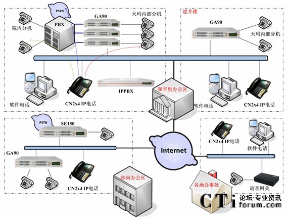 具體情況是:和平里的總部與沙河辦公區(qū)之間為網(wǎng)絡(luò)專線,并有公網(wǎng)出口。各辦事處使用ADSL撥號上網(wǎng)方式?偛康姆桨冈O(shè)計(jì)中,使用了5臺GA90網(wǎng)關(guān),兩臺IPPBX以及多部IP話機(jī)和軟件電話。和平里辦公區(qū)工位數(shù)量為120左右,其中多數(shù)工位需要部署模擬話機(jī),個(gè)別工位屬于非固定的移動(dòng)工位,需要部署CN2x4