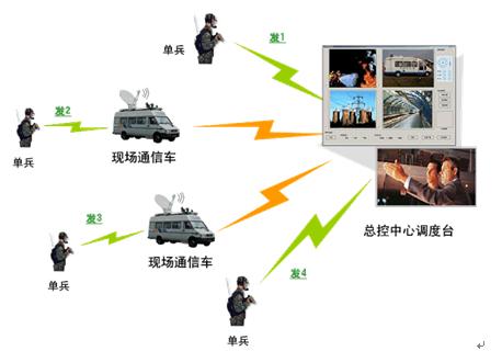 在具體應(yīng)用中,工作人員(士兵)攜帶單兵背負(fù)終端深入現(xiàn)場(災(zāi)區(qū)、廣場、戰(zhàn)場等),將現(xiàn)場視頻實(shí)時(shí)回傳到后方的應(yīng)急通信車或指揮中心,同時(shí)現(xiàn)場人員可以和指揮中心建立雙向語音通信,指揮中心根據(jù)現(xiàn)場真實(shí)的視頻信息并結(jié)合現(xiàn)場人員語音匯報(bào),可以做出更有針對性、更具準(zhǔn)確性的指揮決策。