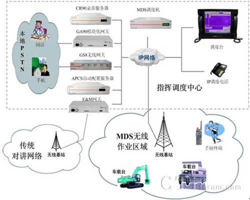 MDS系統(tǒng)可以應(yīng)用于各種作業(yè)現(xiàn)場的指揮調(diào)度, MDS系統(tǒng)不但支持系統(tǒng)基本的語音通信,調(diào)度中心可以通過視頻、數(shù)據(jù)、文本消息等綜合的多媒體方式與作業(yè)人員進行通信交互,滿足各種復(fù)雜環(huán)境下的指揮調(diào)度需求。系統(tǒng)可以通過GS8無線網(wǎng)關(guān)、GA90