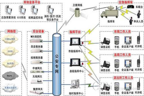 系統(tǒng)基于公安專網(wǎng)部署,融合衛(wèi)星網(wǎng)絡、PSTN、GSM/CDMA、集群對講網(wǎng)絡等各種網(wǎng)絡,采用專業(yè)的多媒體調(diào)度平臺實現(xiàn)省、市、縣各級公安機關之間的互聯(lián)互通和多級指揮調(diào)度,實現(xiàn)語音、視頻、數(shù)據(jù)的同步傳輸和統(tǒng)一調(diào)度。并能和公安部門現(xiàn)有各種業(yè)務系統(tǒng),如視頻監(jiān)控系統(tǒng)、接處警系統(tǒng)、GIS系統(tǒng)、應急預案系統(tǒng)、數(shù)據(jù)庫系統(tǒng)等集成,實現(xiàn)多系統(tǒng)相互調(diào)用,協(xié)同工作。