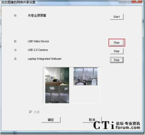 打開動態(tài)圖像網(wǎng)絡(luò)共享圖像設(shè)置列表,可以看到共享全屏屏幕下面有3個不同的顯示,這表示在這臺電腦上一共插了3個攝像機,點擊顯示欄右側(cè)的“start”,就可以把攝像機的圖像設(shè)置為共享的圖像,這3個攝像機可以同時共享,也可以只設(shè)置其中的某一個。點擊“start”后按鈕就會變?yōu)椤皊top”,這時攝像機所獲取到得圖像也會在列表中顯示。下圖是將3個攝像機都設(shè)為共享的圖像的效果: