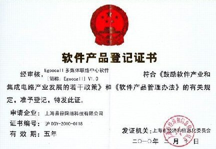 CTI論壇(ctiforum)3月8日消息(記者 袁青): 由易谷網(wǎng)絡(luò)自行研發(fā)的“Egoocall多媒體聯(lián)絡(luò)中心軟件”,于2010年2月10日通過(guò)上海市經(jīng)濟(jì)和信息化委員會(huì)審核,獲頒“軟件產(chǎn)品登記證書”。(證書號(hào):滬DGY-2010-0118)