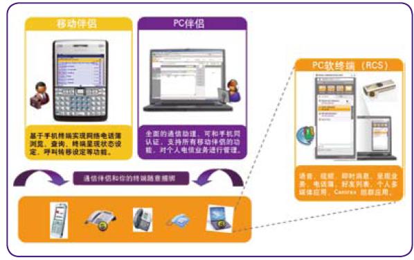 這些管理可以通過(guò)通信伴侶(移動(dòng)伴侶或PC伴侶)來(lái)完成。PC軟終端支持在PC機(jī)上實(shí)現(xiàn)Centrex,消息,電話本,在線狀態(tài),好友列表, 視頻通話等功能。