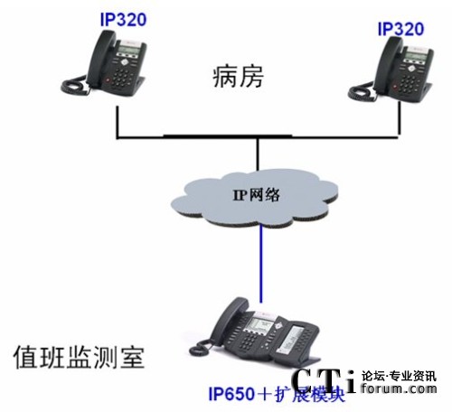 SoundPoint IP320。監(jiān)控室的值班醫(yī)生需要和患者溝通時,只需按IP650上病房相應(yīng)的快速撥號鍵,一鍵快速的呼叫病房的IP320。病房的患者也可以摘機或按免提鍵自動呼叫監(jiān)測室的IP650,和值班醫(yī)生進行溝通。當值班醫(yī)生和患者通話時,其它患者的電話呼叫監(jiān)測室,值班醫(yī)生可以看到是哪個病房呼叫的,可以馬上接聽,也可以結(jié)束當前通話后根據(jù)通話記錄回呼患者進行溝通。