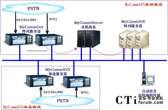 MyCommAVS自動語音系統(tǒng)由MyCommDev設備控制器、MyCommServer核心服務器和MyCommIVR流程解析器三大核心模塊組成。根據(jù)不同模塊部署方式,可以建議兩大模式方案: