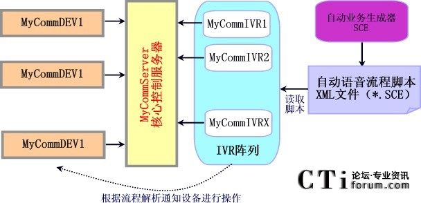 MyCommServer:核心控制服務器。實現(xiàn)對呼叫的控制,和管理DEV設備控制器和IVR流程解析器等周邊設備。