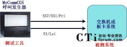 直接將MyCommCGS呼叫發(fā)生器與被測系統(tǒng)對(duì)接直連,連接電纜可以采用數(shù)字中繼或者模擬線路,信令支持中國7號(hào)、中國1號(hào)或者ISDN