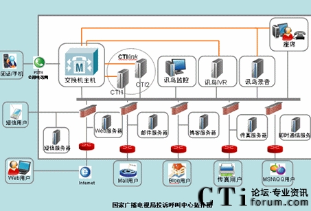 系統(tǒng)主要包含IVR服務(wù)器,CTI服務(wù)器,短信網(wǎng)關(guān),郵件服務(wù)器,傳真服務(wù)器,數(shù)據(jù)庫服務(wù)器,座席系統(tǒng)等?蛻魮艽蛱胤柎a接入廣電公司客服系統(tǒng),首先由IVR提供自動語音服務(wù)。CTI服務(wù)器負責(zé)所有的電話的路由、排隊、轉(zhuǎn)接和控制。客戶在接受自動語音服務(wù)時,如果需要人工幫助,可選擇轉(zhuǎn)入人工座席。由IVR系統(tǒng)向CTI發(fā)出轉(zhuǎn)接請求,完成轉(zhuǎn)接功能。
