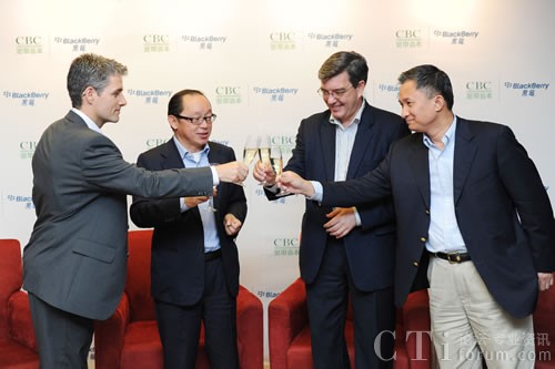 從左到右為:Marc Faucher(黑莓合作伙伴基金合伙人),田溯寧先生(CBC寬帶資本創(chuàng)始人),謝國睿先生(RIM中國區(qū)總裁),許志明先生(CBC寬帶資本投資團(tuán)隊成員)