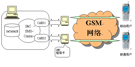 采用短信卡方式的短信系統(tǒng)結(jié)構(gòu)如下圖,短消息通過內(nèi)置PCI短信卡發(fā)送,通過靈活多變的接口,與其他系統(tǒng)集成,組成短信應(yīng)用系統(tǒng)。