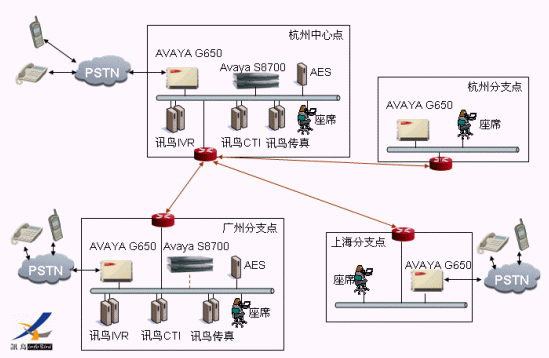 整個呼叫中心包括一個中心點杭州創(chuàng)業(yè)大廈,3個分支點分別在杭州華星大廈、上海與廣州。實現(xiàn)中繼分散接入,座席分散與集中相結(jié)合,整個呼叫中心集中控制的方式。杭州中心點采用一套AVAYA S8710、一套訊鳥CTI/IVR/傳真集中控制,其他各點通過G650接入。其中廣州分支點由于座席數(shù)較多,單獨部署一臺AES服務(wù)器、一套訊鳥CTI/IVR/傳真服務(wù)器。廣州點的一套AVAYA S8700作為本地再生服務(wù),一旦廣域網(wǎng)電路中斷,立即接管承擔一個獨立的呼叫中心,AES服務(wù)器、訊鳥CTI、IVR服務(wù)器隨之與新的AVAYA S8700交換機聯(lián)接,保證24小時不間斷運行的要求。