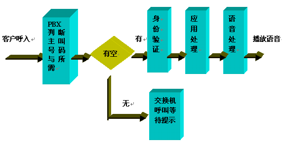 客戶撥打服務(wù)號(hào)進(jìn)入交換機(jī)自動(dòng)語(yǔ)音排隊(duì)系統(tǒng)ACD排隊(duì),如無(wú)空閑,播放提示等待信息及音樂(lè)。如有空閑,進(jìn)入IVR系統(tǒng)的語(yǔ)音引導(dǎo)菜單,用戶在IVR的語(yǔ)音提示下,通過(guò)逐層按鍵選項(xiàng),進(jìn)入相應(yīng)的語(yǔ)音應(yīng)答服務(wù)。這類服務(wù)包括業(yè)務(wù)咨詢、專家咨詢、公告信息、個(gè)股信息等。這類服務(wù)的語(yǔ)音內(nèi)容通常為準(zhǔn)靜態(tài)的語(yǔ)音信息。只需定期維護(hù)即可。其流程示意如圖: