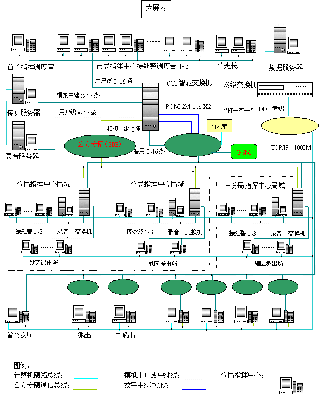 - 樹立大網(wǎng)絡概念:采用先進的通訊、計算機網(wǎng)絡技術(采用CTI可編程交換技術),利用現(xiàn)有的通信資源,實現(xiàn)市局指揮中心與消防大隊、交警大隊、各派出所的計算機網(wǎng)絡及相關領導辦公室計算機大聯(lián)網(wǎng);形成全市范圍內(nèi)110、119、122有線、無線全方位立體調(diào)度語音通道大網(wǎng)。