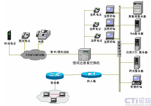 其中局域網(wǎng),為呼叫中心專用的局域網(wǎng),也可以和現(xiàn)有的網(wǎng)絡(luò)在同一個(gè)局域網(wǎng)絡(luò)內(nèi),在網(wǎng)段上沒有特殊要求,局域網(wǎng)通過防火墻和路由器連通廣域網(wǎng)。