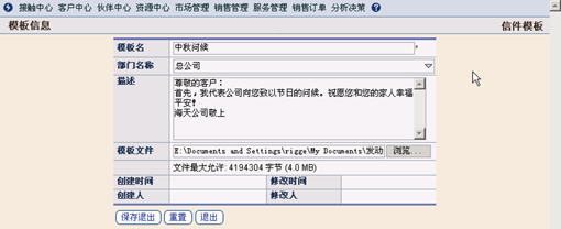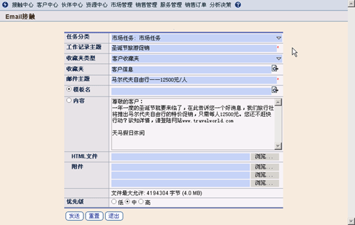 電子郵件接觸方式可以方便企業(yè)在極短的時間內(nèi)為大量的客戶發(fā)布各種信息,比如:企業(yè)需要為客戶提供的促銷信息、服務(wù)通告,或者節(jié)日問候等。TurboCRM系統(tǒng)可以將郵件模板與選取的客戶資料進(jìn)行自動匹配,瞬間即可將信息發(fā)送給大量客戶。