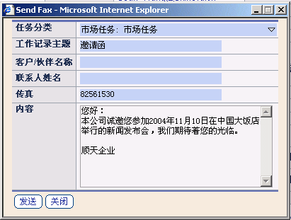 在與客戶進(jìn)行接觸的時候,為了提高信息傳遞的及時性,傳真也是一個不錯的選擇。TurboCRM系統(tǒng)可以幫助企業(yè)通過發(fā)送傳真的形式與自己的客戶進(jìn)行接觸,比如:企業(yè)需要在短時間內(nèi)發(fā)送一批活動邀請函和申請表,就可以利用這種發(fā)送批量傳真的形式,比之信件的傳遞方式不僅節(jié)省成本,而且為企業(yè)節(jié)省了寶貴的時間。