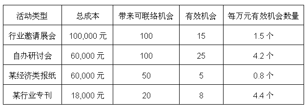 從前面的分析中,我們?cè)?jīng)談到過:市場的核心是用最低的成本,幫助企業(yè)把目標(biāo)客戶推動(dòng)成為機(jī)會(huì)客戶。那么,同樣成本推動(dòng)為有效機(jī)會(huì)客戶數(shù)量的多少,則是評(píng)價(jià)市場方案的有效模型。當(dāng)然,針對(duì)個(gè)人消費(fèi)市場,似乎可以用更加簡單的投入產(chǎn)出比進(jìn)行分析,一種類型的市場投放運(yùn)作,在一定時(shí)間內(nèi)帶來的業(yè)績收益與成本的比較,可以方便地了解到不同類型市場投放的效益對(duì)比;而對(duì)于大部分需要有銷售過程的機(jī)構(gòu)消費(fèi)客戶,我們可以參考以下我們對(duì)劉總公司拿出的模型示例: