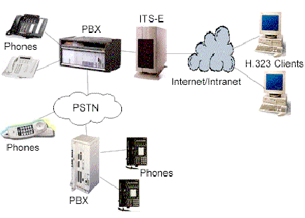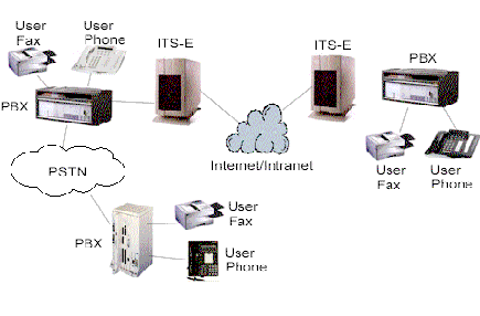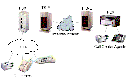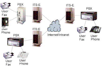 許多公司有多個辦公地點,各地之間有著頻繁的通訊往來,電話和傳真。典型地,通訊涉及到公用交換電話網(wǎng)(PSTN)或PBX間的私人連接路線。Internet電話服務(wù)器(ITS-E)提供了另一選擇;驹硎且惶幱脩魮艽虻碾娫捊(jīng)本地PBX路由到本地ITS-E,本地ITS-E通過IP網(wǎng)絡(luò)送到目的地ITS-E,目的地ITS-E再將電話送到目的地PBX上,最后送到目的地電話或傳真機上。