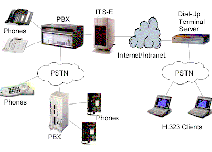 計算機IP電話產(chǎn)品,類似網(wǎng)絡(luò)會議系統(tǒng),允許用戶使用他們當前的IP聯(lián)接把通話接到電腦上去(如通過以太網(wǎng)聯(lián)接到他們的局域網(wǎng)中)。這種作法的局限是PC用戶只可以與另一PC用戶通話。然而,使用ITS-E,這種局限將不存在。任何在網(wǎng)絡(luò)上的PC可使用H.323(用于IP電話上的ITU-T標準)軟件包來實現(xiàn)通話,如微軟的網(wǎng)絡(luò)會議系統(tǒng),通過ITS-E服務(wù)器通至一個常規(guī)的電話使用者。電話用戶不需要任何新的裝備,甚至不會意識到聲音是從PC機中傳出及在IP網(wǎng)絡(luò)中傳輸。示意圖如下: