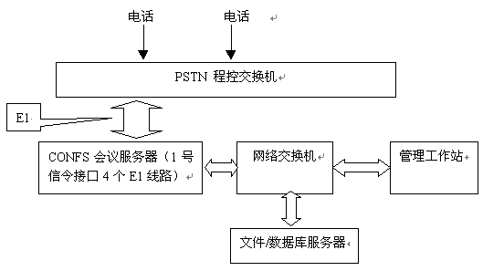 系統(tǒng)主要由網(wǎng)絡(luò)、數(shù)據(jù)庫服務(wù)器(DBS)、會議服務(wù)器(CONFS)、管理工作站幾個(gè)部分組成。數(shù)據(jù)庫服務(wù)器主要負(fù)責(zé)數(shù)據(jù)的存儲,而CONFS完成電話話路的接入與會議控制,彼此之間相輔相承。如圖所示: