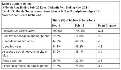 按截至今年2月份的三個(gè)月的平均數(shù)計(jì)算,美國(guó)手機(jī)用戶中有74.8%的用戶利用手機(jī)發(fā)送短信,相比截止去年11月的三個(gè)月上升2.2個(gè)百分點(diǎn);有49.5%的用戶使用了下載的應(yīng)用程序(上升4.6個(gè)百分點(diǎn)),有49.2%的用戶使用瀏覽器(上升4.8個(gè)百分點(diǎn)),有36.1%的用戶訪問(wèn)社交網(wǎng)站或博客(上升了3.1個(gè)百分點(diǎn));有32.3%有用戶利用手機(jī)玩游戲(上升2.6個(gè)百分點(diǎn)),有24.8%的用戶利用手機(jī)聽(tīng)音樂(lè)(上升3.1個(gè)百分點(diǎn))。