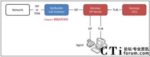 呼叫中心的蓬勃發(fā)展帶動了呼叫中心廠家投入巨資開發(fā)呼叫中心最核心的功能,例如拓展呼叫中心的接入,座席的管理,洗號系統(tǒng)。除了支持Asterisk,F(xiàn)reeswitch平臺的高并發(fā)A116 16E1做為高并發(fā)呼叫中心以外,Sangoma早在2004 年就開始和世界知名呼叫中心廠家Genesys 合作,開發(fā)了呼叫中心的洗號系統(tǒng),遠(yuǎn)端座席管理,PSTN 接入等強(qiáng)大的工具,從而提高了大型呼叫中心的接通率和座席管理的靈活性。Sangoma 通過genesys 兼容性測試,完全兼容Genesys 呼叫中心平臺。NetBorder 系統(tǒng)架構(gòu)如下: