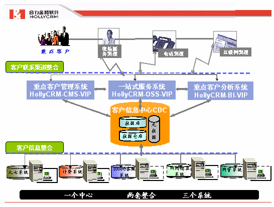 HOLLYCRM(合力金橋軟件)基于電信行業(yè)IT發(fā)展和山東省通信公司重點客戶管理系統(tǒng)建設(shè)目標和原則的要求,根據(jù)多年來對電信CRM領(lǐng)域的研究以及在實際項目建設(shè)實施過程中的經(jīng)驗獲得,科學地提出了針本項目的"一個中心,二套整合,三個系統(tǒng)"的建設(shè)理念。如下圖: