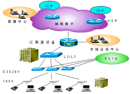 在用戶接入層Quidway S3026V提供24路VDSL接入,在普通雙絞線上提供12Mbps的雙向?qū)ΨQ數(shù)據(jù)業(yè)務(wù),傳輸距離最大可達(dá)1500m,在完成以太網(wǎng)接入的同時,不影響POTS業(yè)務(wù)。S3026V上行FE接口直接接入L3交換機。同時,通過雙絞用戶線完成了與PSTN交換機的相連,將寬帶、窄帶業(yè)務(wù)在S3026V上匯合,并通過已有雙絞電話線連接至遠(yuǎn)端用戶設(shè)備(1805)。1805可以通過五類線與計算機網(wǎng)卡相連。